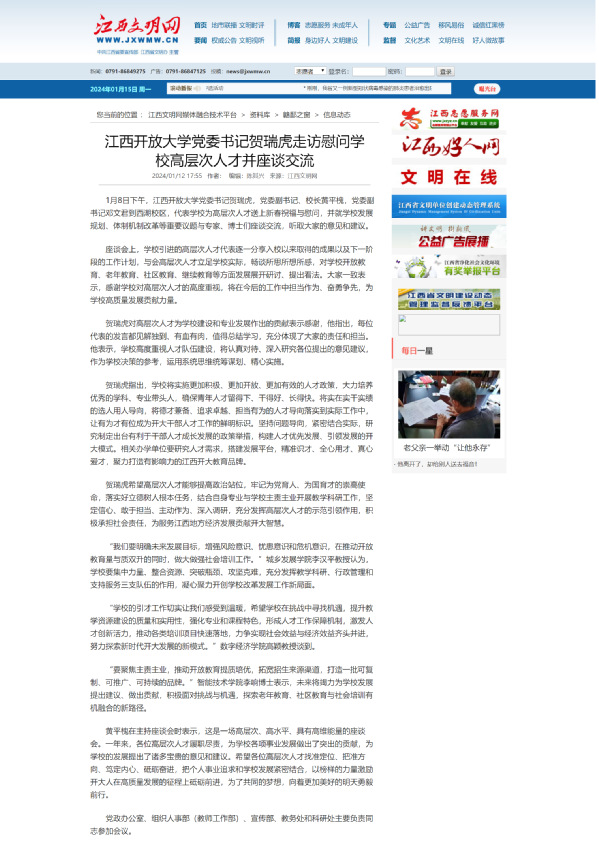 近日,beat365在线唯一官网党委书记贺瑞虎,党委副书记、校长黄平槐,党委副书记邓文君到西湖校区,代表学校为高层次人才送上新春祝福与慰问,并就学校发展规划、体制机制改革等重要议题与专家、博士们座谈交流,听取大家的意见和建议。