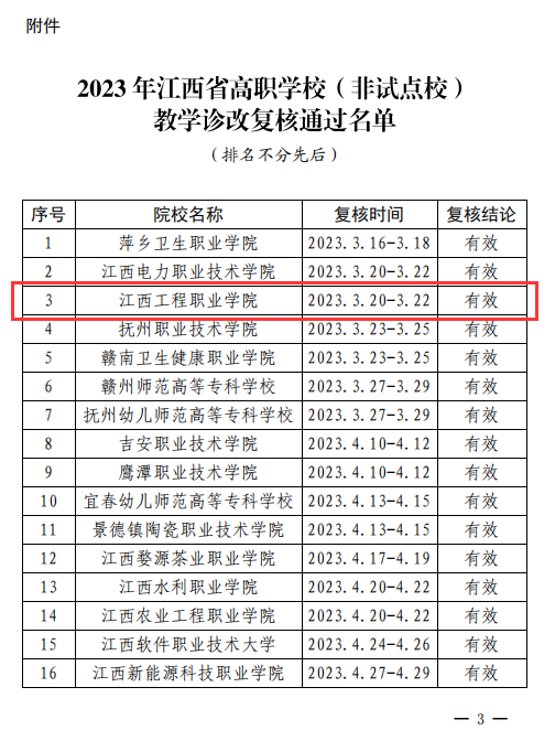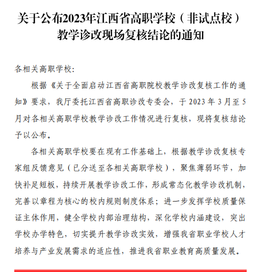近日,江西省教育厅印发《关于公布2023年江西省高职学校(非试点校)教学诊改现场复核结论的通知》,学校顺利通过高职学校(非试点校)教学诊改现场复核。此前,beat365于2022年7月通过网上复核,2023年3月20日-22日开展现场复核。