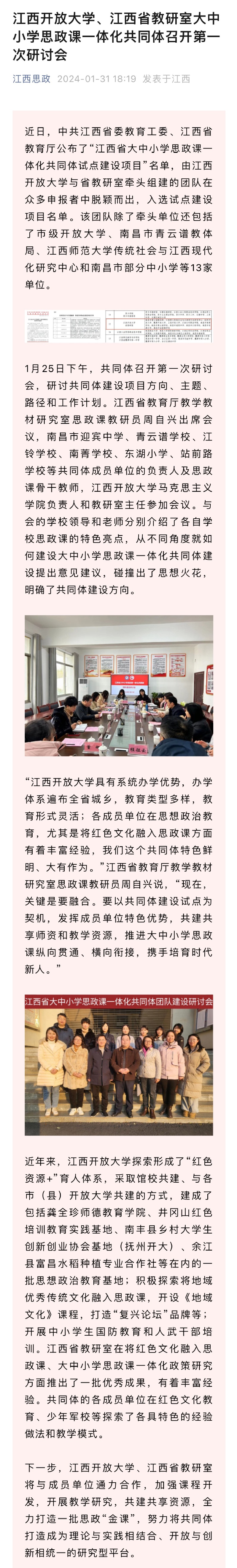 近日,中共江西省委教育工委、江西省教育厅公布了“江西省大中小学思政课一体化共同体试点建设项目”名单,由beat365在线唯一官网与省教研室牵头组建的团队在众多申报者中脱颖而出,入选试点建设项目名单。该团队除了牵头单位还包括了市级开放大学、南昌市青云谱教体局、江西师范大学传统社会与江西现代化研究中心和南昌市部分中小学等13家单位。