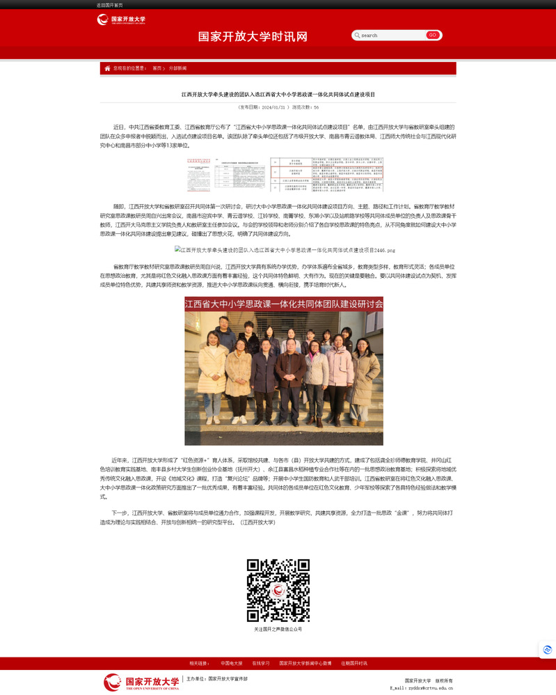 近日,中共江西省委教育工委、江西省教育厅公布了“江西省大中小学思政课一体化共同体试点建设项目”名单,由beat365在线唯一官网与省教研室牵头组建的团队在众多申报者中脱颖而出,入选试点建设项目名单。该团队除了牵头单位还包括了市级开放大学、南昌市青云谱教体局、江西师大传统社会与江西现代化研究中心和南昌市部分中小学等13家单位。