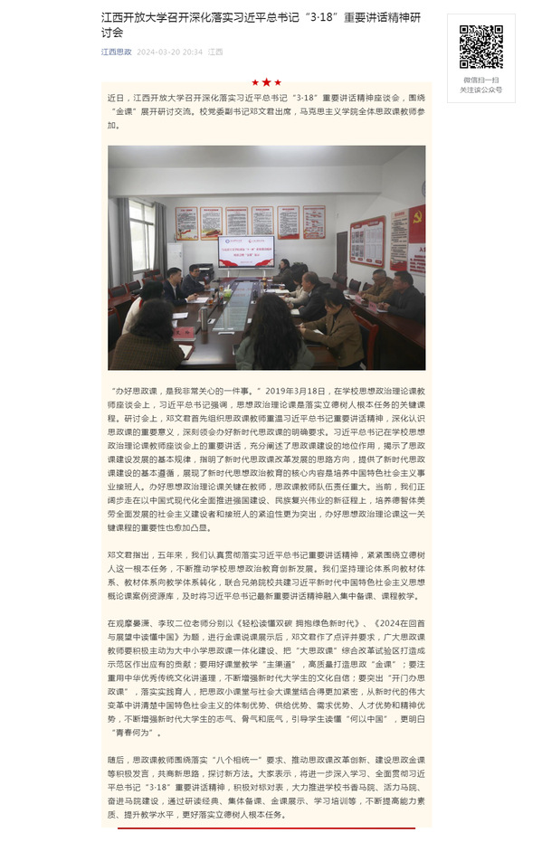 近日,beat365在线唯一官网召开深化落实习近平总书记“3·18”重要讲话精神座谈会,围绕“金课”展开研讨交流。校党委副书记邓文君出席,马克思主义学院全体思政课教师参加。原文地址:https://mp.weixin.qq.com/s?__biz=MzI1OTM4MDMzMA==&mid=2247586050&idx=7&sn=65c05563f91e130d269f0e822120b618&chksm=ea7a1407dd0d9d115e96a6bff961a12ff6c2cbab3eab98138a42f1b6a3c23433e8f0b59e7196&mpshare=1&scene=1&srcid=0321TcutXRY5vG0d4xWKpTfU&sharer_shareinfo=2c7f280329b2a5dcea2226cfda2ce737&sharer_shareinfo_first=2c7f280329b2a5dcea2226cfda2ce737&exportkey=n_ChQIAhIQRaTYqwrHn55mvsfu2jGkrBLuAQIE97dBBAEAAAAAALspKMjOvrYAAAAOpnltbLcz9gKNyK89dVj0rm%2FG1Bgtl%2BOJK3oyL2EgdiszSDxH3QfK9Wsgxme26k46zqeFh4sDI3oaUr8b5W54%2BpOcsGGyEP6ZYVMGCm1I5H2iFFDUZmHCKx%2Fnby9zS%2BWnB8HkK5%2B64rViYHwlzuJexmaKXYDPNA0T1QhUN5ahT%2FaKtnXyDnJTtOg0crt%2Ft8GhTMXSsvThG%2F82ZtXCoZDMQeNYnf9D9Nh7d3jnTZ4jR2crnzyVvWSBfJmPI9Z6yb76BXQE4RsonGqZ0CN5iMY3C5vmNHHbMzo%3D&acctmode=0&pass_ticket=fMjC1G9f0eUcd6Rvy17lLRc8iJr3Zk6gV0q4RacC2qIFoyY2j8w3WA5Cx2UgkHCX4T%2Bg3bU2HapmuRNtUPPGew%3D%3D&wx_header=0#rd (责任编辑:罗楚颖)