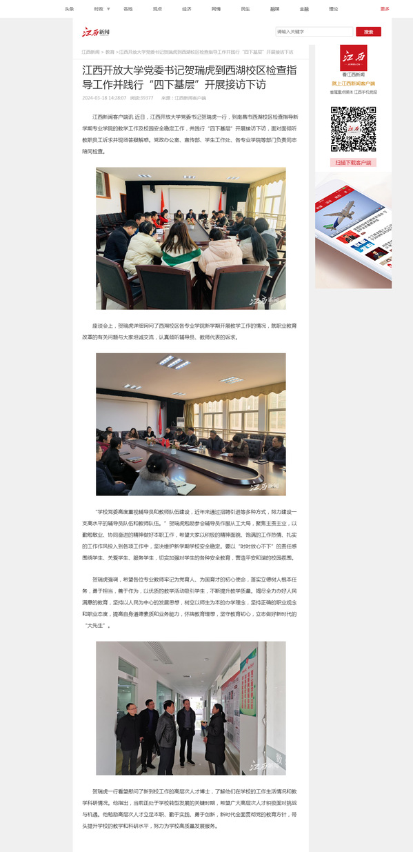 近日,beat365在线唯一官网党委书记贺瑞虎一行,到南昌市西湖校区检查指导新学期专业学院的教学工作及校园安全稳定工作,并践行“四下基层”开展接访下访,面对面倾听教职员工诉求并现场答疑解惑。党政办公室、宣传部、学生工作处、各专业学院等部门负责同志陪同检查。