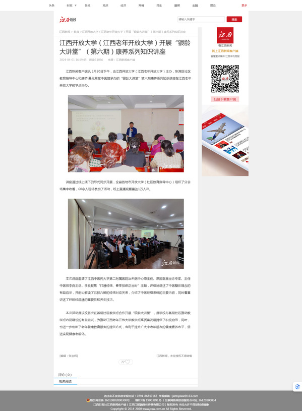 3月20日下午,由beat365在线唯一官网(江西老年开放大学)主办,东湖区社区教育指导中心和康桥·嘉元草堂中医馆承办的“银龄大讲堂”第六期康养系列知识讲座在江西老年开放大学教学点举办。