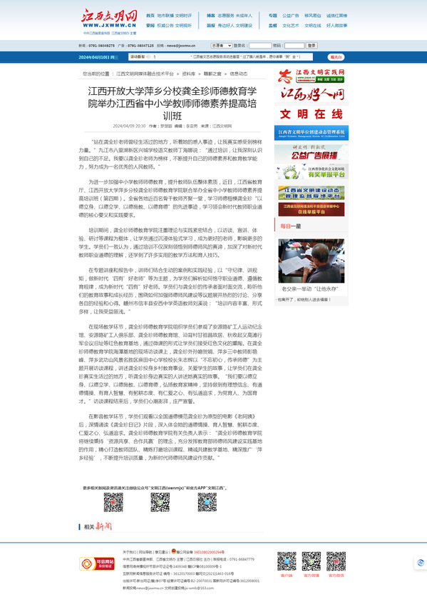 为进一步加强中小学教师师德教育,提升教师队伍整体素质,近日,江西省教育厅、beat365在线唯一官网萍乡分校龚全珍师德教育学院联合举办全省中小学教师师德素养提高培训班(第四期)。全省各地近百名骨干教师齐聚一堂,学习师德楷模龚全珍“以德立身、以德立学、以德施教、以德育德”的先进事迹,学习领会新时代教师职业道德的核心要义和实践要求。