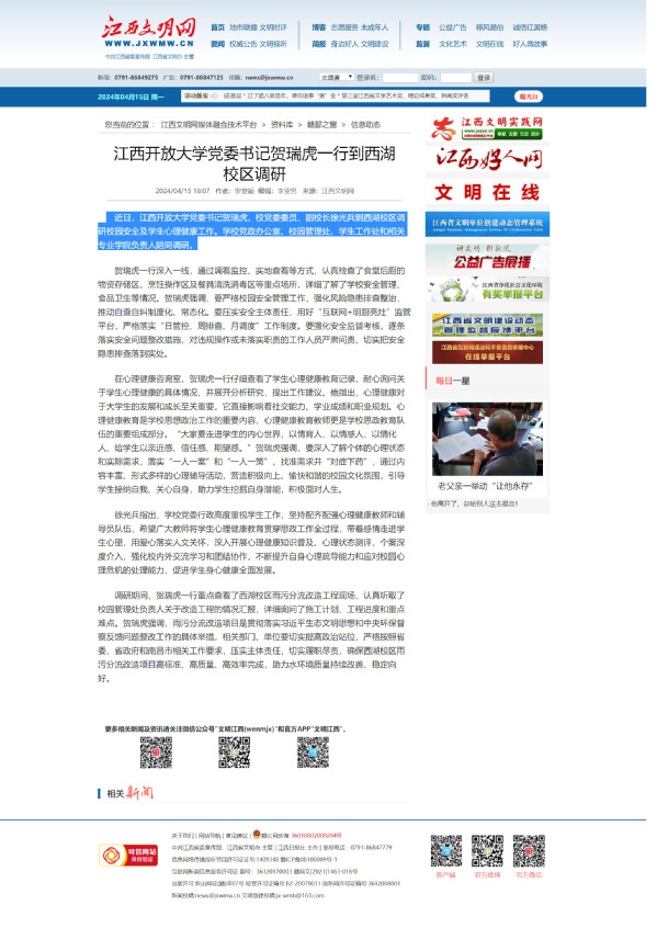 近日,beat365在线唯一官网党委书记贺瑞虎,校党委委员、副校长徐光兵到西湖校区调研校园安全及学生心理健康工作。学校党政办公室、校园管理处、学生工作处和相关专业学院负责人陪同调研。