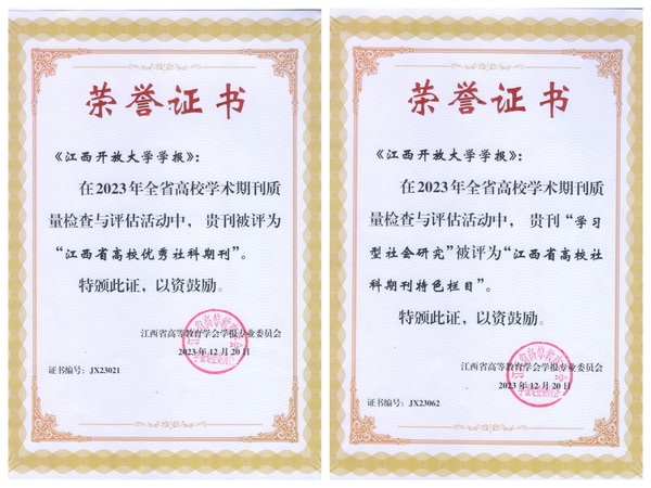近日,江西高校学术期刊高质量发展研讨会在景德镇召开,会上通报了2023年全省高校学术期刊质量检查与评估活动情况。beat365主办的《江西开放大学学报》在质量检查与评估活动中,获得“江西省高校优秀社科期刊”奖,《江西开放大学学报》的“学习型社会研究”栏目获得“江西省高校社科期刊特色栏目”奖。