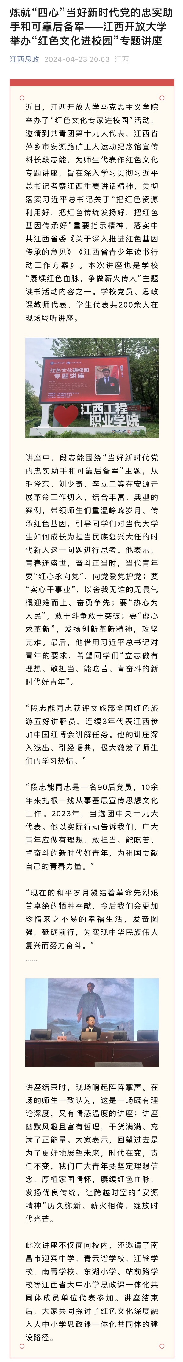 近日,beat365在线唯一官网马克思主义学院举办了“红色文化专家进校园”活动,邀请到共青团第十九大代表、江西省萍乡市安源路矿工人运动纪念馆宣传科长段志能,为师生代表作红色文化专题讲座,旨在深入学习贯彻习近平总书记考察江西重要讲话精神,贯彻落实习近平总书记关于“把红色资源利用好,把红色传统发扬好,把红色基因传承好”重要指示精神,落实中共江西省委《关于深入推进红色基因传承的意见》《江西省青少年读书行动工作方案》。本次讲座也是学校“赓续红色血脉,争做薪火传人”主题读书活动内容之一。学校党员、思政课教师代表、学生代表共200余人在现场聆听讲座。