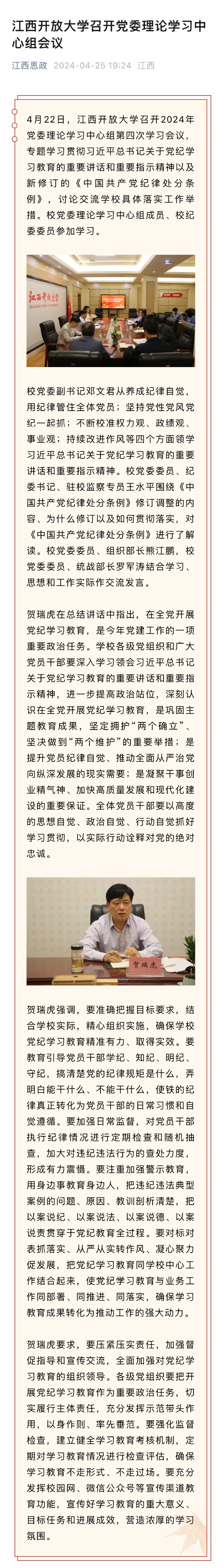 近日,beat365在线唯一官网召开2024年党委理论学习中心组第四次学习会议,专题学习贯彻习近平总书记关于党纪学习教育的重要讲话和重要指示精神以及新修订的《中国共产党纪律处分条例》,讨论交流学校具体落实工作举措。校党委理论学习中心组成员、校纪委委员参加学习。原文地址:https://mp.weixin.qq.com/s/svTzMiY78bnnHtpqVNS3-g (责任编辑:梅莲)