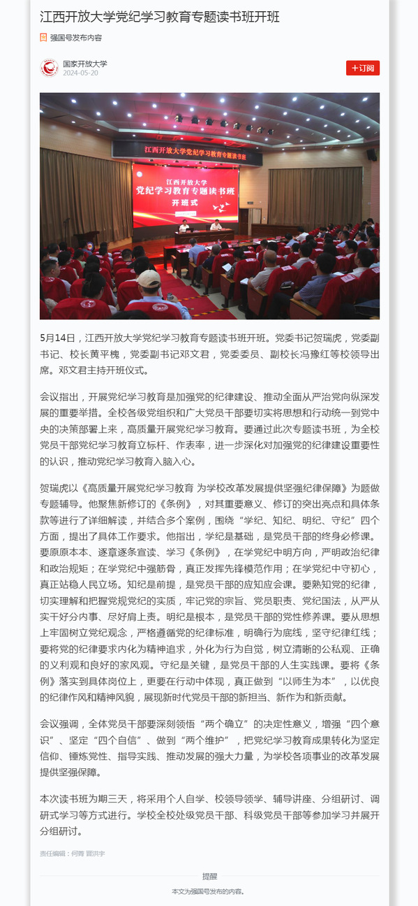 5月14日,beat365在线唯一官网党纪学习教育专题读书班开班。党委书记贺瑞虎,党委副书记、校长黄平槐,党委副书记邓文君,党委委员、副校长冯豫红等校领导出席。邓文君主持开班仪式。原文地址:https://article.xuexi.cn/articles/index.html?art_id=14596902533786430190&item_id=14596902533786430190&study_style_id=feeds_opaque&pid=&ptype=-1&source=share&share_to=wx_single (责任编辑:罗楚颖)