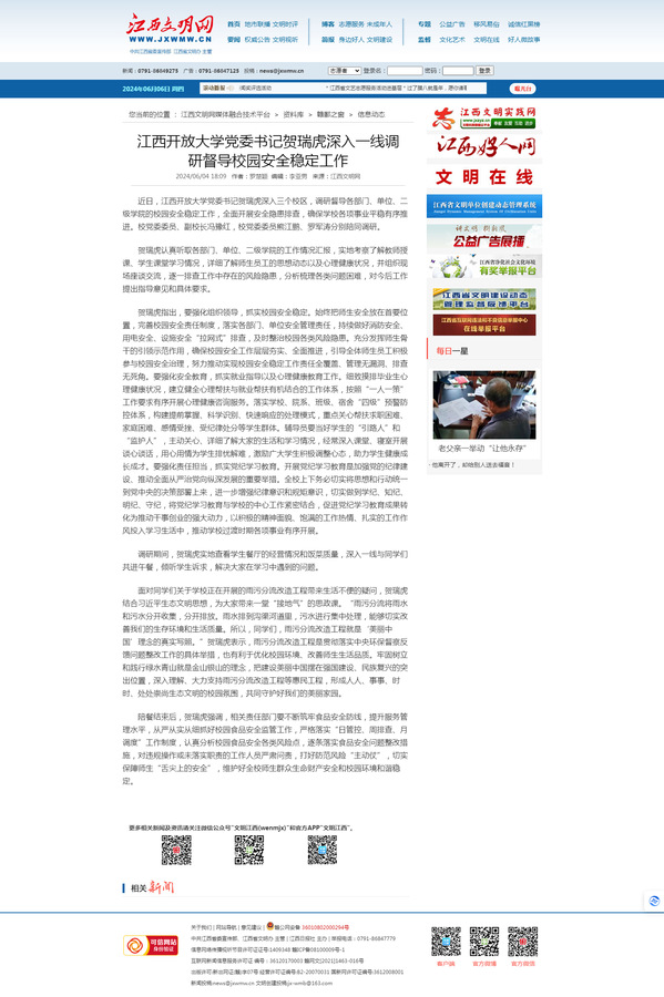 近日,beat365在线唯一官网党委书记贺瑞虎深入三个校区,调研督导各部门、单位、二级学院的校园安全稳定工作,全面开展安全隐患排查,确保学校各项事业平稳有序推进。校党委委员、副校长冯豫红,校党委委员熊江鹏、罗军涛分别陪同调研。