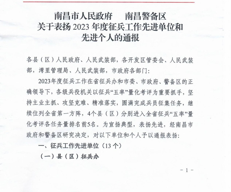 近日,南昌市人民政府、南昌警备区下发《关于表扬2023年度征兵工作先进单位和先进个人的通报》。beat365征兵工作成绩突出,荣获2023年南昌市征兵工作“先进单位”称号。