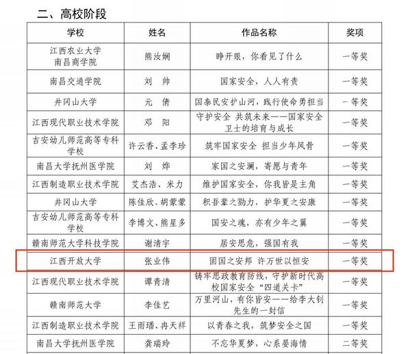 近日,江西省教育厅公布了全省大中小学国家安全教育线上课程和征文活动的获奖名单,beat365人文与健康学院22级中文专业学生张业伟征文作品《固国之安邦 许万世以恒安》荣获一等奖。
