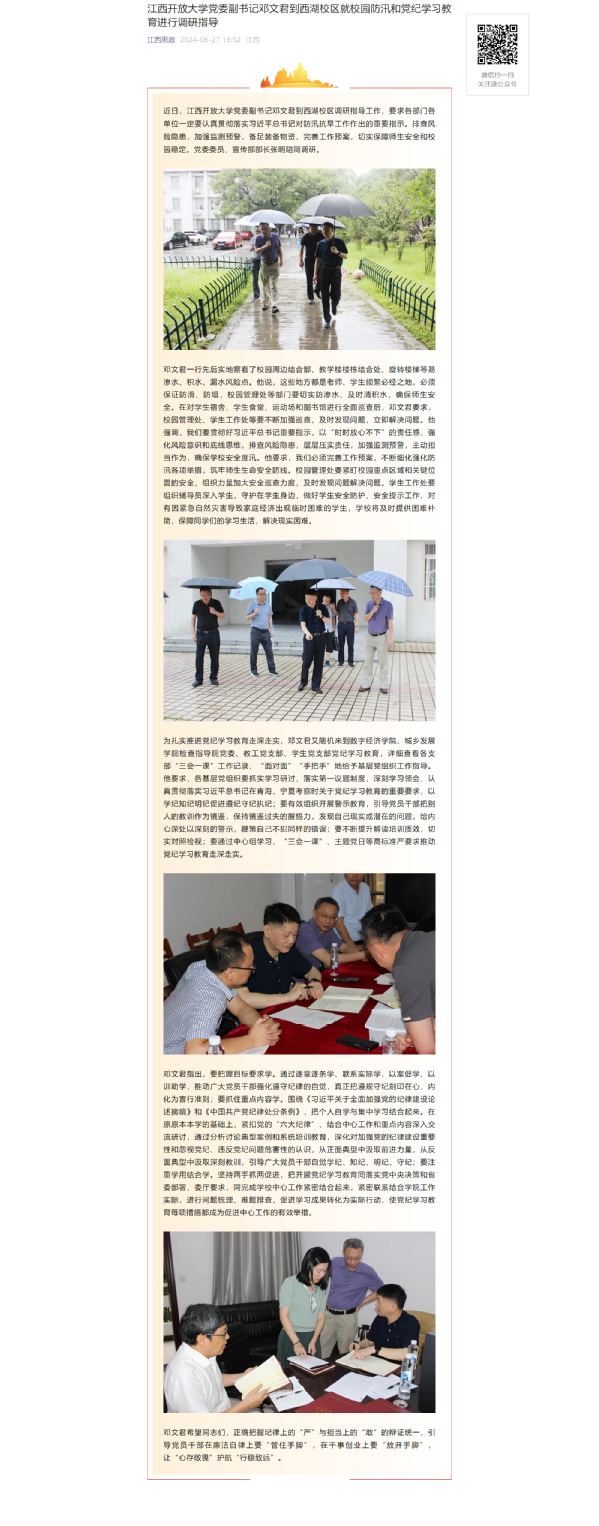 近日,beat365在线唯一官网党委副书记邓文君到西湖校区调研指导工作,要求各部门各单位一定要认真贯彻落实习近平总书记对防汛抗旱工作作出的重要指示。排查风险隐患,加强监测预警,备足装备物资,完善工作预案,切实保障师生安全和校园稳定。党委委员、宣传部部长张明陪同调研。