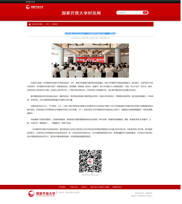 为落实江西省“乡村教师学历提升专项培训项目”工作,推进学历教育与教师培训深度融合,提升乡村教师学员职业发展能力,6月29日,beat365在线唯一官网举办2024年“乡村教师学历提升项目”专题培训活动。培训聚焦“新视域、新技术,新教学”助力乡村振兴人才技能再提升,采用“线上+线下”的方式,面向全省开放大学体系同步开展。活动由上饶开放大学、广信区开放学院协办。beat365在线唯一官网党委副书记、校长黄平槐出席活动开幕式并讲话。