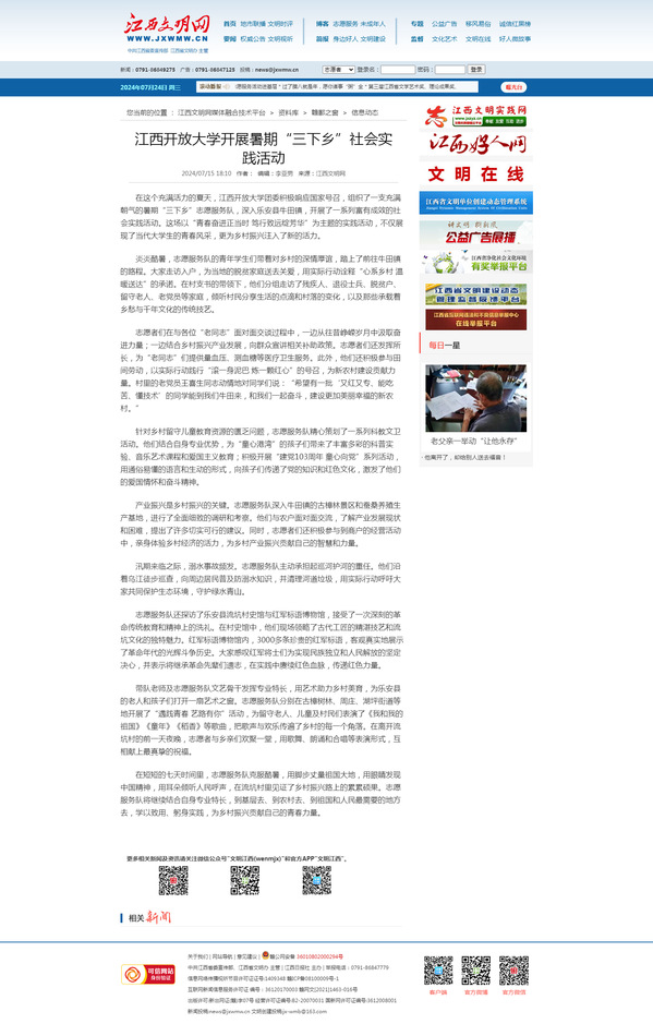 在这个充满活力的夏天,beat365在线唯一官网团委积极响应国家号召,组织了一支充满朝气的暑期“三下乡”志愿服务队,深入乐安县牛田镇,开展了一系列富有成效的社会实践活动。这场以“青春奋进正当时 笃行致远绽芳华”为主题的实践活动,不仅展现了当代大学生的青春风采,更为乡村振兴注入了新的活力。