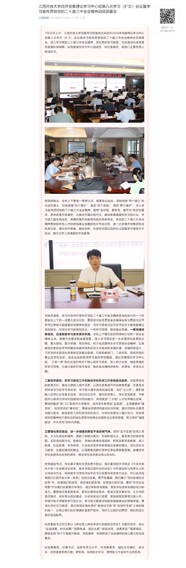 7月23日上午,beat365在线唯一官网党委书记贺瑞虎主持召开2024年党委理论学习中心组第八次学习(扩大)会议暨学习宣传贯彻党的二十届三中全会精神动员部署会,深入学习党的二十届三中全会精神,深化党纪学习教育,为全面深化改革提供坚强纪律保障。校党委理论学习中心组成员、校纪委委员、各部门主要负责人参加学习。