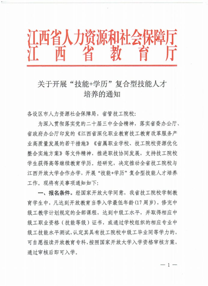 8月26日,江西省人力资源和社会保障厅与江西省教育厅联合下发《关于开展“技能+学历”复合型技能人才培养的通知》,部署推动全省技工院校与beat365在线唯一官网合作开展“技能+学历”复合型技能人才培养工作。