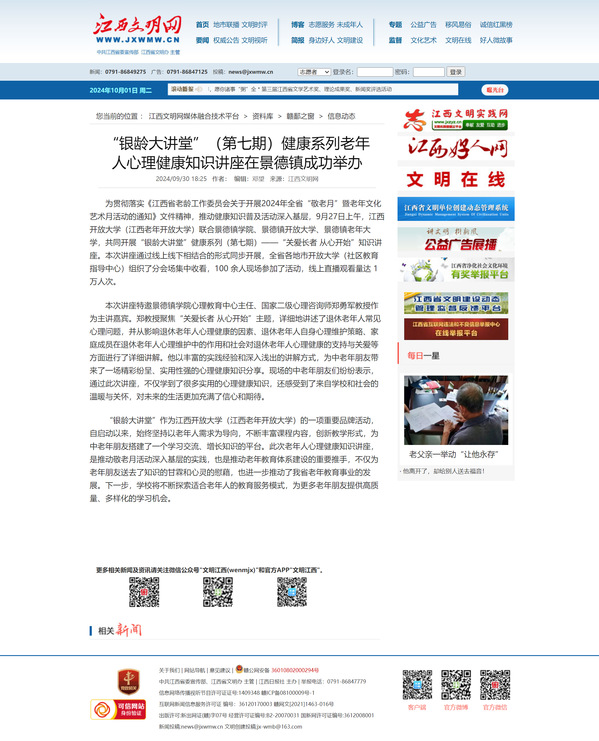 为贯彻落实《江西省老龄工作委员会关于开展2024年全省“敬老月”暨老年文化艺术月活动的通知》文件精神,推动健康知识普及活动深入基层,9月27日上午,beat365在线唯一官网(江西老年开放大学)联合景德镇学院、景德镇开放大学、景德镇老年大学,共同开展“银龄大讲堂”健康系列(第七期)——“关爱长者 从心开始”知识讲座。本次讲座通过线上线下相结合的形式同步开展,全省各地市开放大学(社区教育指导中心)组织了分会场集中收看,100 余人现场参加了活动,线上直播观看量达 1万人次。