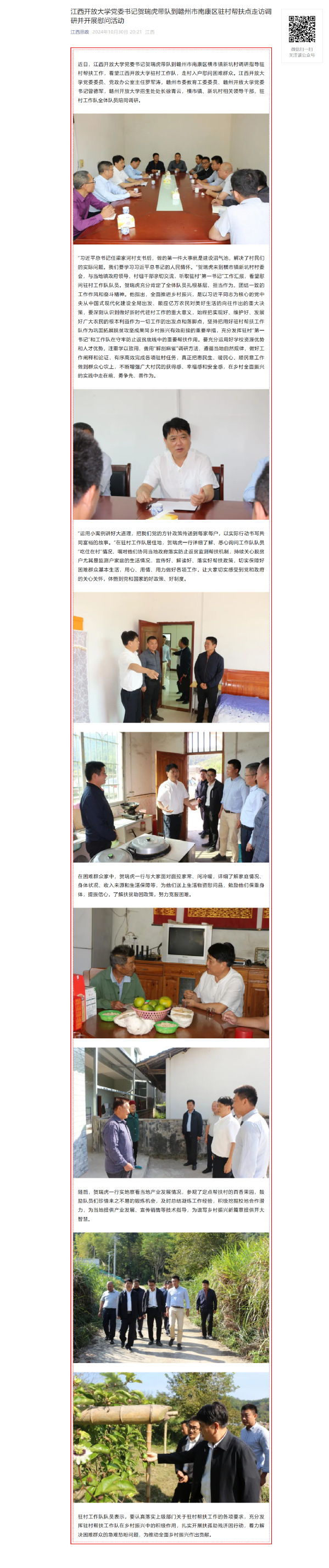 近日,beat365在线唯一官网党委书记贺瑞虎带队到赣州市南康区横市镇新坑村调研指导驻村帮扶工作,看望beat365在线唯一官网驻村工作队,走村入户慰问困难群众。beat365在线唯一官网党委委员、党政办公室主任罗军涛,赣州市委教育工委委员、赣州开放大学党委书记曾德军,赣州开放大学招生处处长徐青云,横市镇、新坑村相关领导干部,驻村工作队全体队员陪同调研。