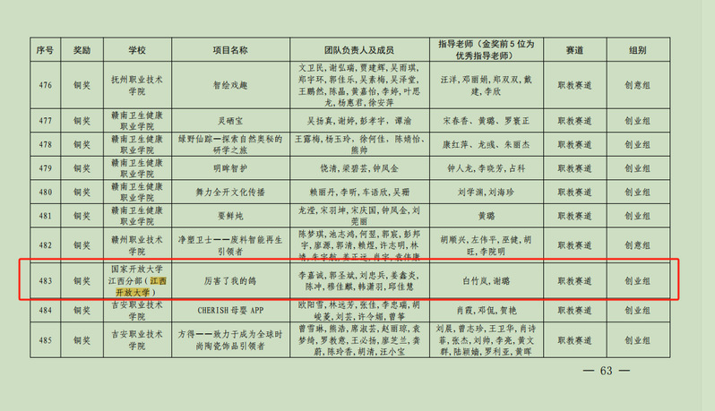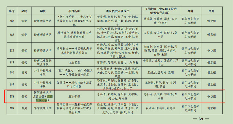 近日,江西省教育厅公布了江西省大学生创新大赛(2024)获奖名单。学校招生就业工作处(创新创业中心)推荐报送的《厉害了我的鸽》与《雕琢梦想》两个项目,分别荣获职教赛道创业组铜奖和“青年红色筑梦之旅”赛道公益组铜奖。