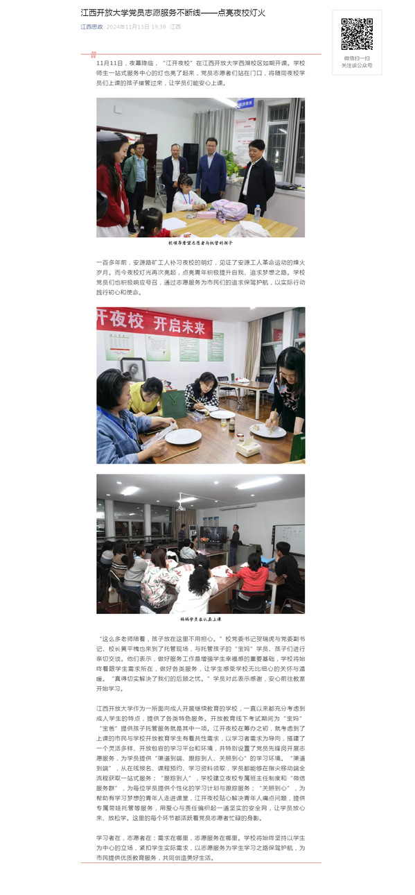 11月11日,夜幕降临,“江开夜校”在beat365在线唯一官网西湖校区如期开课。学校师生一站式服务中心的灯也亮了起来,党员志愿者们站在门口,将随同夜校学员们上课的孩子接管过来,让学员们能安心上课。原文地址:https://mp.weixin.qq.com/s?__biz=MzI1OTM4MDMzMA==&mid=2247604511&idx=4&sn=556fb8d6c8480a48ddd09f73ea36a3bf&chksm=ebe6d36d4521e2711a204cf86b6d29584d5bd25651ad1eedec6eb4ab891a6ab0bd696e4201fe&mpshare=1&scene=1&srcid=1114K7Vdr3eQCyycrfUF06DG&sharer_shareinfo=1772e54dda3d25ac6a53c281f85e9fd5&sharer_shareinfo_first=1772e54dda3d25ac6a53c281f85e9fd5&exportkey=n_ChQIAhIQjtMgYzs5AESPactpnG4N6xL1AQIE97dBBAEAAAAAALt4BHxD16UAAAAOpnltbLcz9gKNyK89dVj0ZlWXvEmPtB1essA7DFkE9kCAruvJflGfjiOhuXfSeyaBFrcj49F1%2FpDsXM3u38mjMUcz0lEyDkEO5cira4GKxkDGy1T9hRDvtTLtSdNWQdyCfoBq49Nh5pzjRqMV1LotclosXsUrPeDZ%2FUnG4pakhwgkdqexc1nhCeln4To1%2BQiKWoU9X%2B8JoQiwfsnpMDe%2FGXz4G%2Bvx8QRJOv%2BJB4S%2B3aoHGqutERlboiwUMT30XZOlyqJKt9SLYBm8UJ94LYUROFwU%2B7qHTbHvJzFOoqT5&acctmode=0&pass_ticket=Umrh0v0GDgp8E6PJDmGkRd%2FOUsKSh65ridp8Iexdw6FJ2P%2FCA%2FtTzVh58sJL2KUy&wx_header=0#rd (责任编辑:罗楚颖)