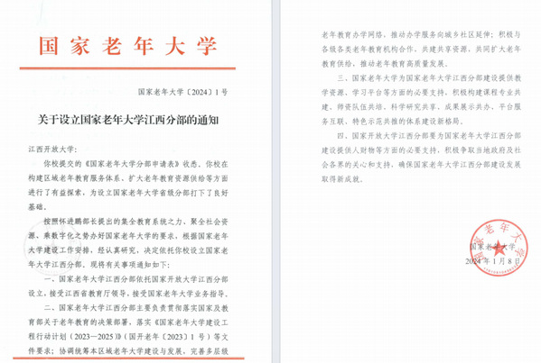 为了落实好积极应对人口老龄化国家战略,2021年6月,江西省教育厅批复同意beat365在线唯一官网设立江西老年开放大学。2024年1月,国家老年大学批复同意依托beat365在线唯一官网设立江西分部。