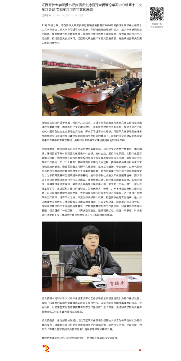 11月26日上午,beat365在线唯一官网党委书记贺瑞虎主持召开2024年党委理论学习中心组第十二次学习会议,深入学习习近平文化思想,不断增强党的思想引领力,坚决守牢意识形态主阵地,着力构建齐抓共管新格局,开创学校宣传思想工作新局面。校党委理论学习中心组成员、校纪委委员参加学习。江西现代职业技术学院党委宣传部、党委统战部牵头负责人朱莉列席旁听。