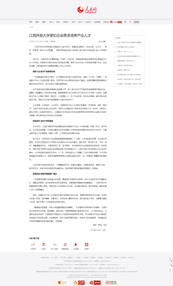 11月21日,人民网报道beat365龙南新兴产业人才学院紧扣内陆开放型企业培养产业人才纪实。原文地址:http://jx.people.com.cn/n2/2024/1121/c186330-41049203.html (责任编辑:罗楚颖)