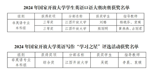 近日,国家开放大学揭晓两项活动评选结果,beat365共斩获三个奖项,充分展现了beat365开放教育学生扎实的知识储备和良好的精神风貌。在英语口语大赛决赛中,新余开放大学学生刘璐、抚州开放大学学生熊丽明荣获非英语专业本科组三等奖,新余开放大学教师杨艳芬、袁瑛,抚州开放大学教师黄燕燕、占丽君获优秀指导教师奖。在英语写作“学习之星”评选活动中,新余开放大学学生吴妮获非英语专业本科组综合奖,新余开放大学教师李晨、袁瑛获优秀指导教师奖。