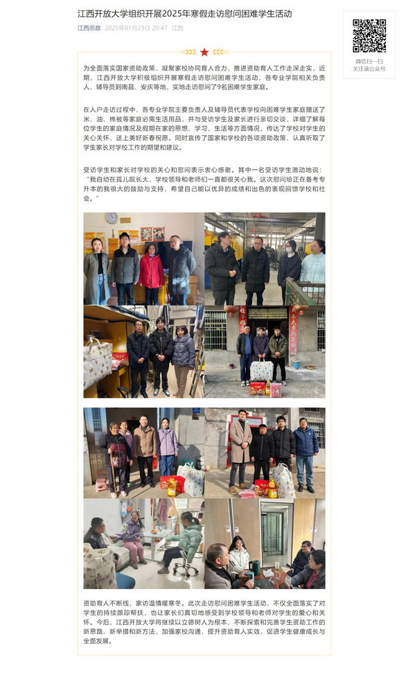 为全面落实国家资助政策,凝聚家校协同育人合力,推进资助育人工作走深走实,近期,beat365在线唯一官网积极组织开展寒假走访慰问困难学生活动,各专业学院相关负责人、辅导员到南昌、安庆等地,实地走访慰问了9名困难学生家庭。原文地址:https://mp.weixin.qq.com/s?__biz=MzI1OTM4MDMzMA==&mid=2247607847&idx=1&sn=4fcfb2e9594adaa8fcbffc63f93a5733&chksm=eb7edcfb0096da9eb02c08205ee226254c11e8b7fc0654f0aee45d8732ef5aa53d5cfde6da94&mpshare=1&scene=1&srcid=0127Oe7s5nzEZlByjUxDX58r&sharer_shareinfo=0b8b8e108a1f6c4c252dc79cf1efdca4&sharer_shareinfo_first=0b8b8e108a1f6c4c252dc79cf1efdca4&exportkey=n_ChQIAhIQS3uvhF8foAMi33cdlEO1IRL1AQIE97dBBAEAAAAAALgqGebEb8AAAAAOpnltbLcz9gKNyK89dVj02Txy213lTqBZEsV6MDSKcVGL1y5JuaHcLsjaKCp9%2FqjD5KX6goeZbCdsCJaoxxwnkql8DLpuE%2Brj4bC02dcQJpNZ7f8HhuhO58wH2eCwHk5cFRlZsugY6xI0Nxow9cfxBVI9emBBCMAoAkKxbEyGSXsZzHurq%2FRHi1VDxudqyU4l5E7pavn3AAY4LPij7H193FtSnqcNjvgosiEn0rs4PlVfx75crxOgX4sHh%2BTdSyaXFCzYr5TLep6lYCiNMigHoxNbBrKsp4ERakRz%2FGu6&acctmode=0&pass_ticket=kmhQEpMcfRi2EEQJN0jKxrfdaTmkRsDW9xCLxRyDctG7lZ12C3V8y2K6IxWHnB9a&wx_header=0#rd (责任编辑:罗楚颖)