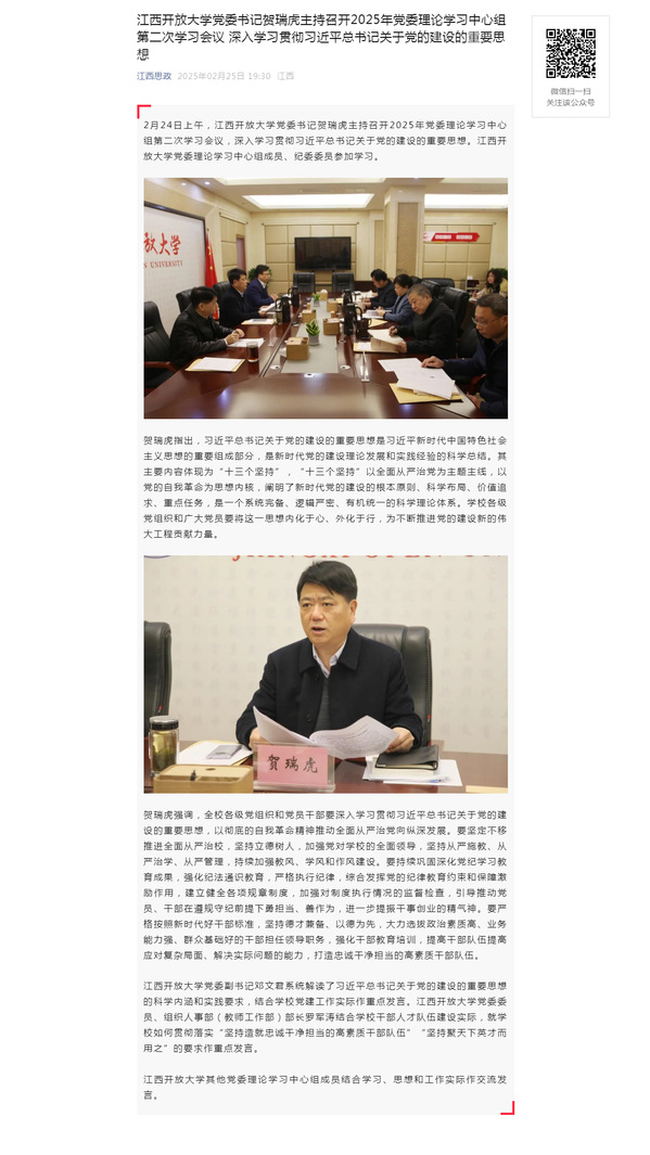 2月24日上午,beat365在线唯一官网党委书记贺瑞虎主持召开2025年党委理论学习中心组第二次学习会议,深入学习贯彻习近平总书记关于党的建设的重要思想。beat365在线唯一官网党委理论学习中心组成员、纪委委员参加学习。原文地址:https://mp.weixin.qq.com/s?__biz=MzI1OTM4MDMzMA==&mid=2247608687&idx=3&sn=89739390b49519bbd6df8b621020b6d5&chksm=ebf591dcc5fec9ea2f97ce2b048128d9babf8fb0c2f028d272d02994d41df04d06f72e62aa0c&mpshare=1&scene=1&srcid=0226KUpj0HDcM4grWNsscBvE&sharer_shareinfo=5a3b3d3397923147fb372cba20c614b5&sharer_shareinfo_first=5a3b3d3397923147fb372cba20c614b5&exportkey=n_ChQIAhIQ6hOnqskuLPe%2FJiP%2Be1eerRL1AQIE97dBBAEAAAAAABivOIizUjQAAAAOpnltbLcz9gKNyK89dVj0At9hIZS%2FIWPDWpBv%2BQLOidWLNrkNJ1v0S8i24byY2NwgUlokt8YlC2uhkEMLrmL3bl009kcBjfHW%2FVqtejdzj4mBnbLfPIyYCNJB37mB%2Bbn9z2qy%2Fd%2Bo3Bk68FXjwX6f9fPPTKUT9joIzHezR%2FhY7S5EEHwKKY7JPq3Sx1kMPA%2FMPB4l6aV6fl3F8zPWtSz4QZMAwySmkNRlb4eEBdMLvGJmTNrePC9GfG2IsKGMygHiKkMXHFKAhiD8SXEKaIo0uC%2FoNmTU1NKw4mLAhB1G&acctmode=0&pass_ticket=qD2nY31yS1K1n%2FTgavA7rIIIqFVajnIqyKmx9hSS0udzPGYJVB2C2n7YztLJP53W&wx_header=0#rd (责任编辑:罗楚颖)