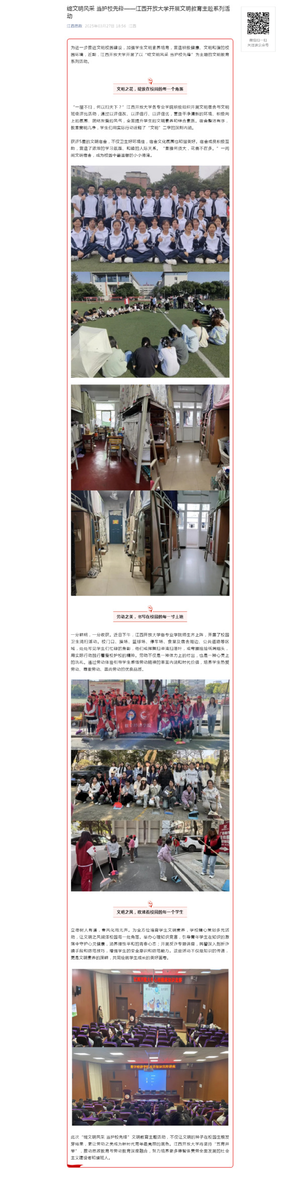 为进一步推进文明校园建设,加强学生文明素养培育,营造积极健康、文明和谐的校园环境,近期,beat365在线唯一官网开展了以“绽文明风采 当护校先锋”为主题的文明教育系列活动。原文地址:https://mp.weixin.qq.com/s?__biz=MzI1OTM4MDMzMA==&mid=2247609975&idx=3&sn=a77b658147b7346590a0eba1634f270f&chksm=eba1f063ef6b5ca4a50687748d3d9945082dd44f99fff3251882aa36af45eabadf421afa8a68&mpshare=1&scene=1&srcid=0331kaoYVOeL0tUOUpiZCPxu&sharer_shareinfo=ea3dbad244e2497d20bd7ac4305ccf63&sharer_shareinfo_first=ea3dbad244e2497d20bd7ac4305ccf63&exportkey=n_ChQIAhIQ9%2F6UfLugRf4rKxtBP4W78RL1AQIE97dBBAEAAAAAABFoKitLV7YAAAAOpnltbLcz9gKNyK89dVj0030gZRq9Ax3ruIrVihZwK%2Btxehd%2F1Wmkiv3JeFwoUUxKa3ld5r%2F9w16A%2BJR54tVdE1fdap1%2BRQcAYuGhOpEPXV8Iq8vHt%2FiBYYrlKDMf2DeKjHsAYfY5Tu6r4W%2B7EKyhkj%2BY2LVk3Tz5vRBkFlOcfibDHFv4%2Bb0OJGYN1RuFmhgnsFqIVWrXpcOmN2223wYXr6feK67OQVu0y%2Bm8Gy9ptppbcaoXN8dm9ugSJ6ZnaDVQkx%2BaNdsOLUkRf3hJTdmku7p2bj%2FBYEb1IMmBLdD3&acctmode=0&pass_ticket=70xys3mjVxttQcv2vLHg6RG7%2Bp9kQ3c6eN9Jn1fk%2ByV1ZgsxEuTTTPljB%2Flb08IS&wx_header=0#rd (责任编辑:罗楚颖)