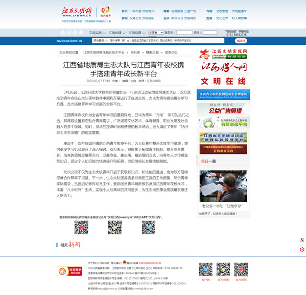 3月26日,beat365在线唯一官网教务处刘震处长一行到访江西省地质局生态大队,双方就推动青年夜校在大队青年群体中顺利开展进行了座谈交流,力求为青年提供更多学习机遇,合力搭建青年学习发展的全新平台。