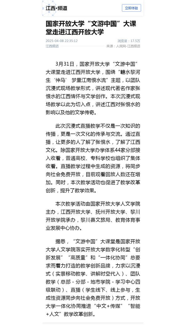 3月31日,国家开放大学“文游中国”大课堂走进beat365在线唯一官网,围绕“赣水黎河生‘仲马’ 梦里江南恨水流”主题,以团队沉浸式现场教学形式,讲述现代著名作家张恨水的江西情怀与文学创作。本次沉浸式现场教学以此为切入点,讲述江西对张恨水的影响以及他的文学传奇。