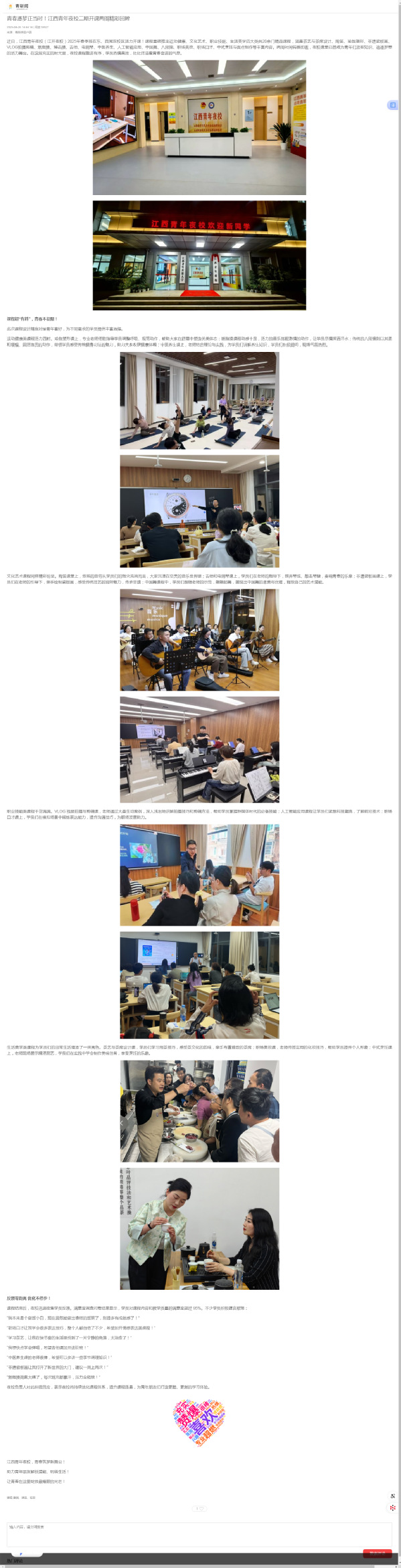 近日,江西青年夜校(江开夜校)2025年春季班在东、西湖双校区活力开课!课程重磅推出运动健康、文化艺术、职业技能、生活美学四大类共20余门精品课程,涵盖茶艺与茶席设计、陶笛、瑜伽塑形、非遗瓷板画、VLOG拍摄剪辑、燃脂操、搏击操、吉他、电钢琴、中医养生、人工智能应用、中国舞、八段锦、职场美妆、职场口才、中式烹饪与面点制作等丰富内容。两周时间转瞬即逝,夜校课堂已然成为青年们汲取知识、追逐梦想的活力舞台。在这段充实的时光里,夜校课程推进有序,学员热情高涨,处处洋溢着青春奋进的气息。