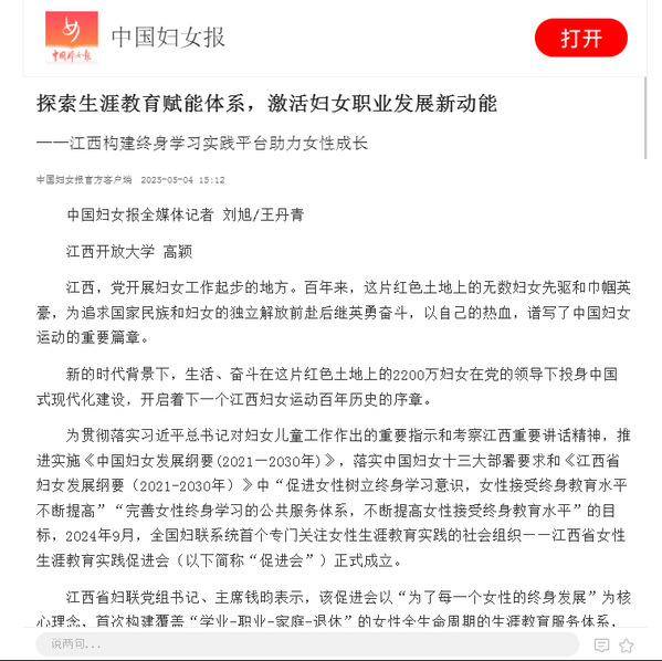 近日,《中国妇女报》报道江西省女性生涯教育实践促进会常务副会长、beat365高颖教授到设区市开展以“探索职业航向·激活成长动能”为主题的宣讲活动。高颖教授结合机关单位工作实际,带大家从生涯的基础理论开始学习,走进生涯的世界。推动女性牢固树立终身学习意识,不断提升女性综合素质能力。