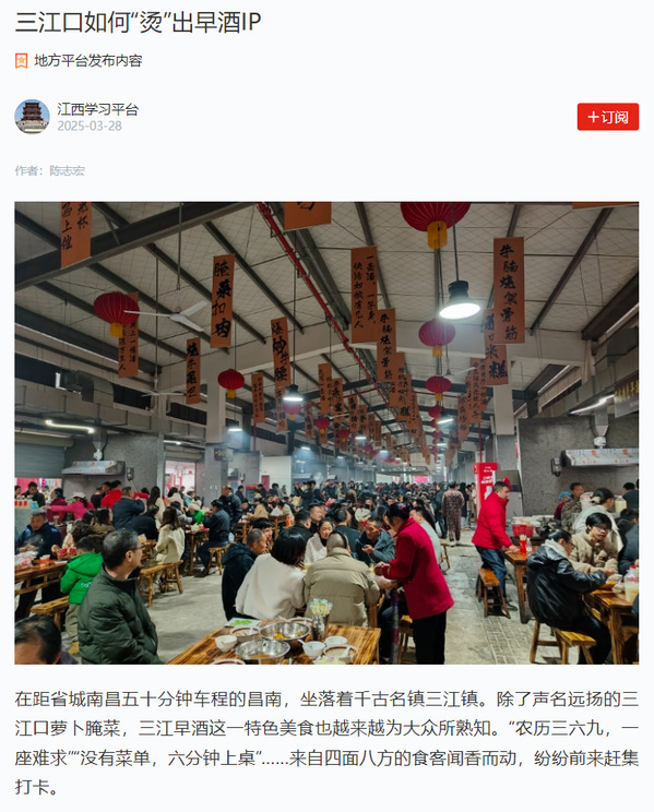 《三江口如何“烫”出早酒IP》原文链接:https://article.xuexi.cn/articles/index.html?art_id=2066408571219816888&cdn=https://region-jiangxi-resource