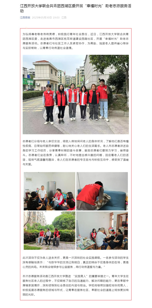 为弘扬尊老敬老传统美德,积极践行青年社会责任,近日,beat365在线唯一官网联合共青团西湖区委,走进南昌市西湖区桃花街道建设西路社区,开展“幸福时光”助老志愿服务活动。志愿者们与社区工作人员紧密协作,为高龄、独居老人提供暖心陪伴与实际帮助,以青春行动传递社会温情。