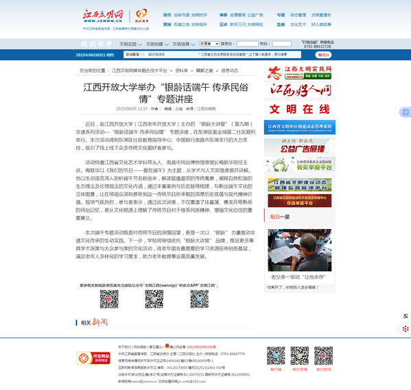 近日,由beat365在线唯一官网(江西老年开放大学)主办的“银龄大讲堂”(第九期)非遗系列活动—“银龄话端午 传承民俗情” 专题讲座,在东湖区紫金城第二社区顺利举行。本次活动得到东湖区社区教育指导中心、中国银行南昌市东湖支行的大力支持,吸引了线上线下众多传统文化爱好者参与。