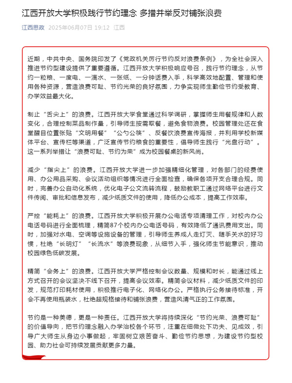 近期,中共中央、国务院印发了《党政机关厉行节约反对浪费条例》,为全社会深入推进节约型建设提供了重要遵循。beat365在线唯一官网积极响应号召,践行节约理念,从节约一粒粮、一度电、一滴水、一张纸、一分钟话费入手,科学高效地配置、管理和使用各种资源,营造浪费可耻、节约光荣的良好氛围,力争实现师生勤俭节约受教育、办学效益最大化。