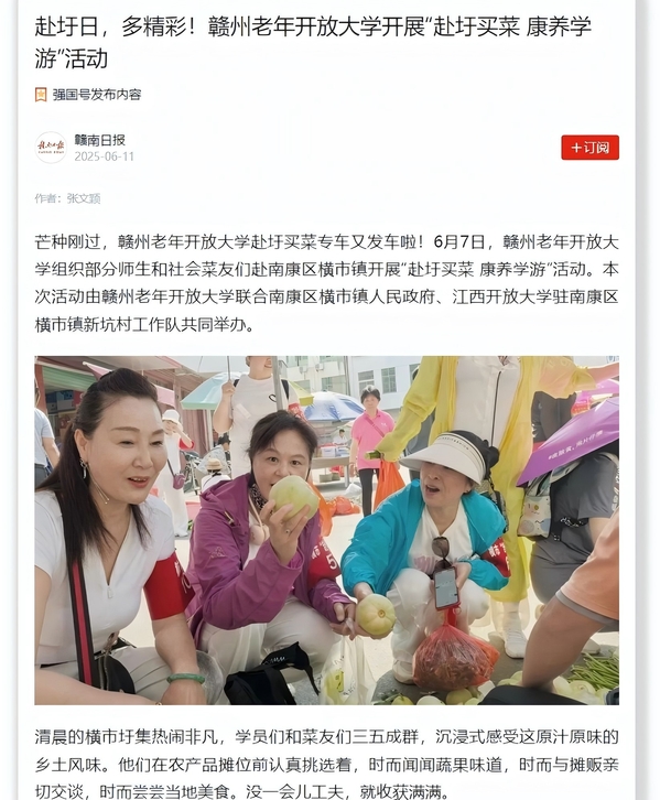 芒种刚过,赣州老年开放大学赴圩买菜专车又发车啦!6月7日,赣州老年开放大学组织部分师生和社会菜友们赴南康区横市镇开展“赴圩买菜 康养学游”活动。本次活动由赣州老年开放大学联合南康区横市镇人民政府、beat365在线唯一官网驻南康区横市镇新坑村工作队共同举办。