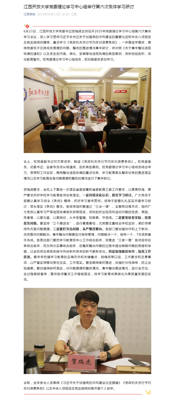 6月13日,beat365在线唯一官网党委书记贺瑞虎主持召开2025年党委理论学习中心组第六次集体学习会议,深入学习贯彻习近平总书记关于加强党的作风建设的重要论述和中央八项规定及其实施细则精神,重点学习《党政机关厉行节约反对浪费条例》,一体推进学查改,围绕党委班子及其成员查摆的问题、整改的推进情况集中研讨,并对照《关于集中整治违规吃喝的通知》以及发生在河南、湖北、安徽等地违规吃喝的典型案例,深刻检视剖析、深化教育警示。校党委理论学习中心组成员,校纪委委员参加学习。