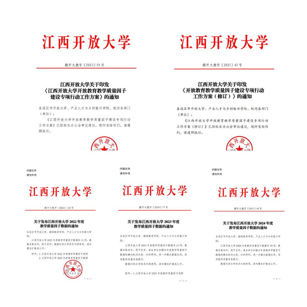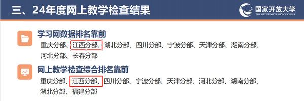 近日,国家开放大学发布《国家开放大学2024年质量监控工作综合通报》,江西分部教学质量因子多项指标位列全国开大系统第一方阵,网上教学检查、学习网数据等排名靠前。