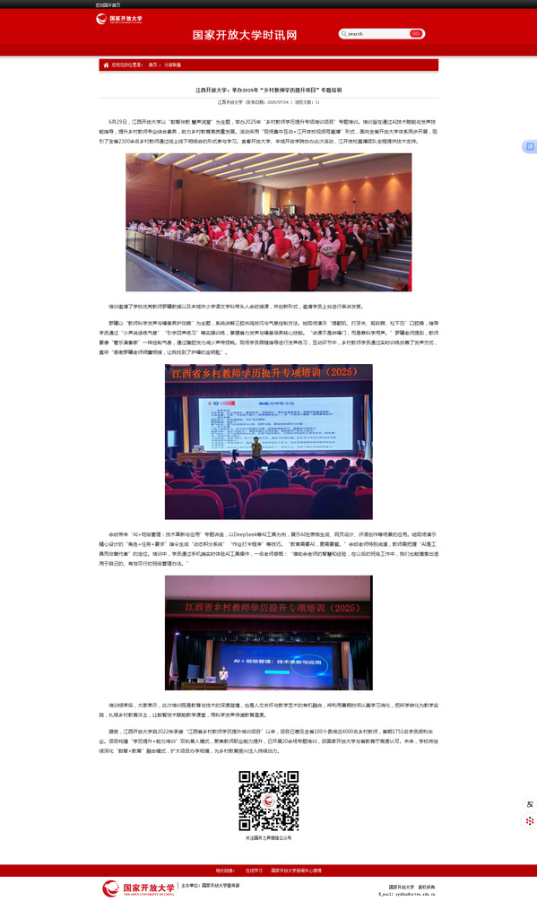 6月29日,beat365在线唯一官网以“数智伴教 慧声润堂”为主题,举办2025年“乡村教师学历提升专项培训项目”专题培训。培训旨在通过AI技术赋能与发声技能指导,提升乡村教师专业综合素养,助力乡村教育高质量发展。活动采用“现场集中互动+江开夜校视频号直播”形式,面向全省开放大学体系同步开展,吸引了全省2300余名乡村教师通过线上线下相结合的形式参与学习。宜春开放大学、丰城开放学院协办此次活动,江开夜校直播团队全程提供技术支持。