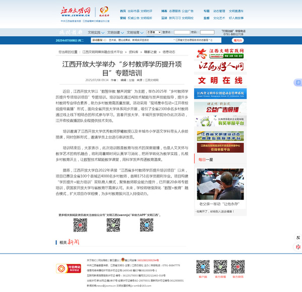 近日,beat365在线唯一官网以“数智伴教 慧声润堂”为主题,举办2025年“乡村教师学历提升专项培训项目”专题培训。培训旨在通过AI技术赋能与发声技能指导,提升乡村教师专业综合素养,助力乡村教育高质量发展。活动采用“现场集中互动+江开夜校视频号直播”形式,面向全省开放大学体系同步开展,吸引了全省2300余名乡村教师通过线上线下相结合的形式参与学习。宜春开放大学、丰城开放学院协办此次活动,江开夜校直播团队全程提供技术支持。
