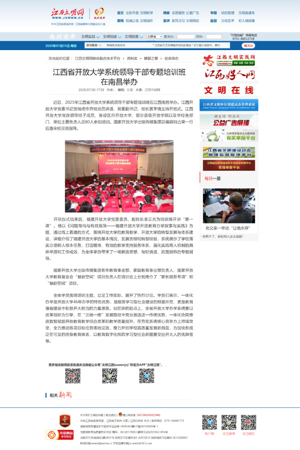 近日,2025年江西省开放大学系统领导干部专题培训班在江西南昌举办。beat365在线唯一官网党委书记贺瑞虎作开班动员讲话,党委副书记、校长黄平槐主持开班式。beat365在线唯一官网党政领导班子成员,各设区市开放大学、部分县级开放学院以及学校各部门、单位主要负责人近80人参加培训。国家开放大学出版传媒集团总编辑刘占荣一行应邀来校交流指导。
