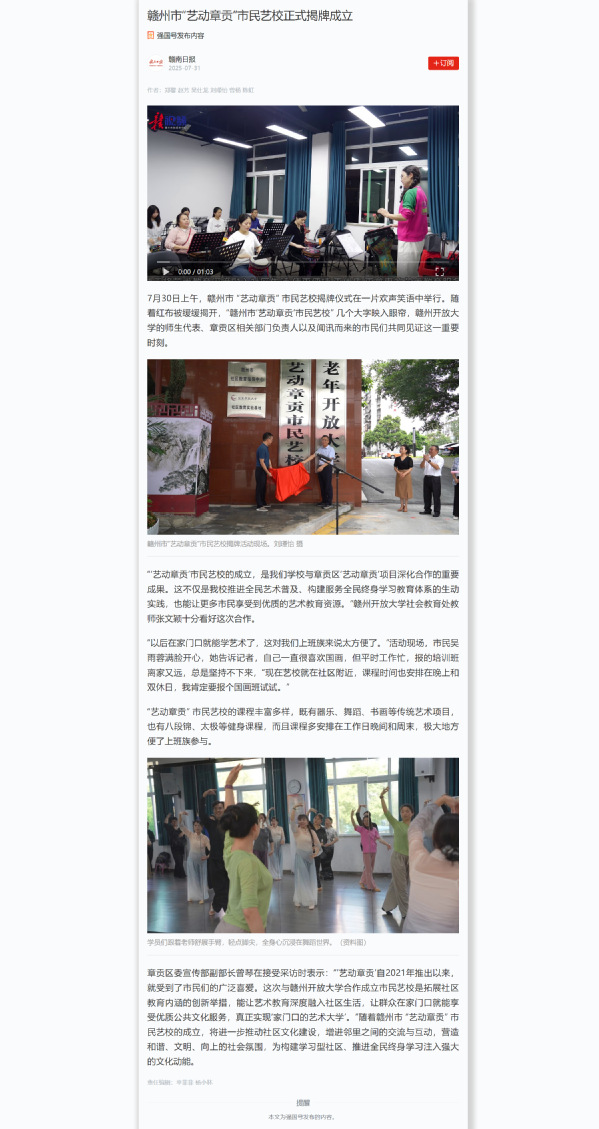 学习强国:赣州市“艺动章贡”市民艺校正式揭牌成立