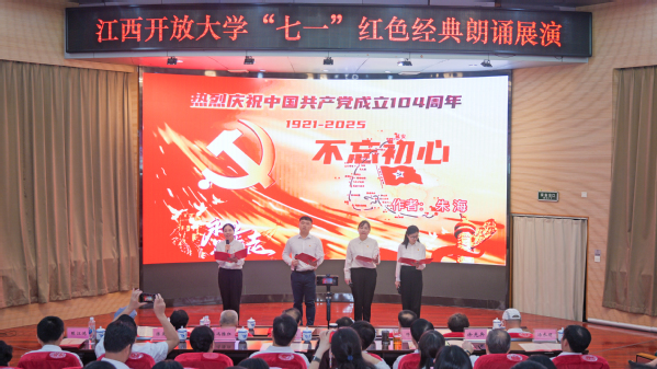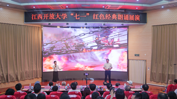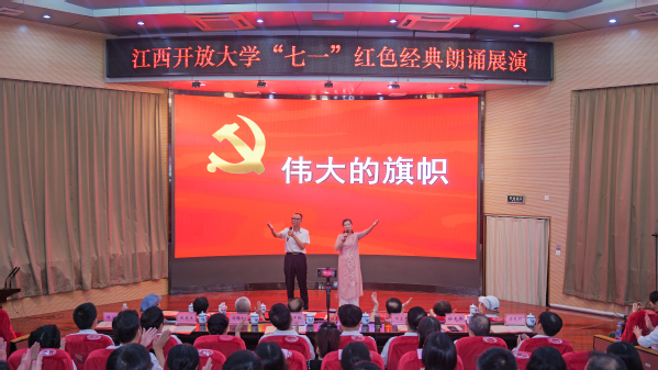 表彰大会结束后,学校携手江西省朗诵与语言艺术协会开展党旗飘扬·声动江开红色经典朗诵展演活动,以红色经典诵读回忆初心,感怀党恩,礼赞伟大祖国。朗诵者们围绕革命历史、英雄事迹、精神传承等核心主题,以创新多元的诵读形式和丰富饱满的诵读内容,让每一个节目都充满了感染力和号召力。歌舞与诵读的鲜活融合,合诵中声情并茂的演绎,现场观众沉浸其中,被朗诵者们的精彩表现深深打动,唤起了深刻的情感共鸣。