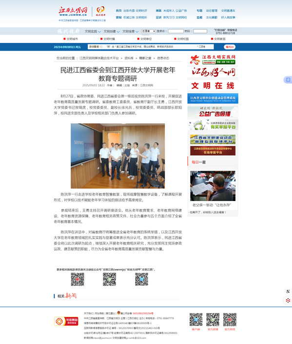 8月27日,省政协常委、民进江西省委会原一级巡视员陈洪萍一行来校,开展促进老年教育高质量发展专题调研。省委教育工委委员、省教育厅副厅长王勇,beat365在线唯一官网党委书记贺瑞虎,校党委委员、副校长徐光兵,校党委委员、统战部部长欧阳萍,校民进支部负责人及学校相关部门负责人参加调研。