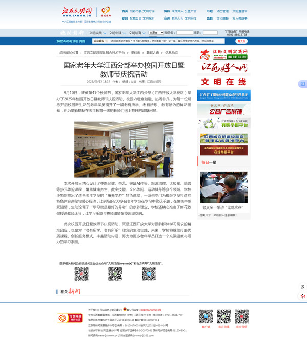 9月10日,正值第41个教师节,国家老年大学江西分部(beat365在线唯一官网校区)举办了2025年校园开放日暨教师节庆祝活动。校园内暖意融融、热闹非凡,为每一位期待开启校园新生活的老年学员铺开了一幅老有所学、老有所乐、老有所为的鲜活画卷,也为辛勤耕耘在老年教育一线的教师们送上节日的诚挚问候。